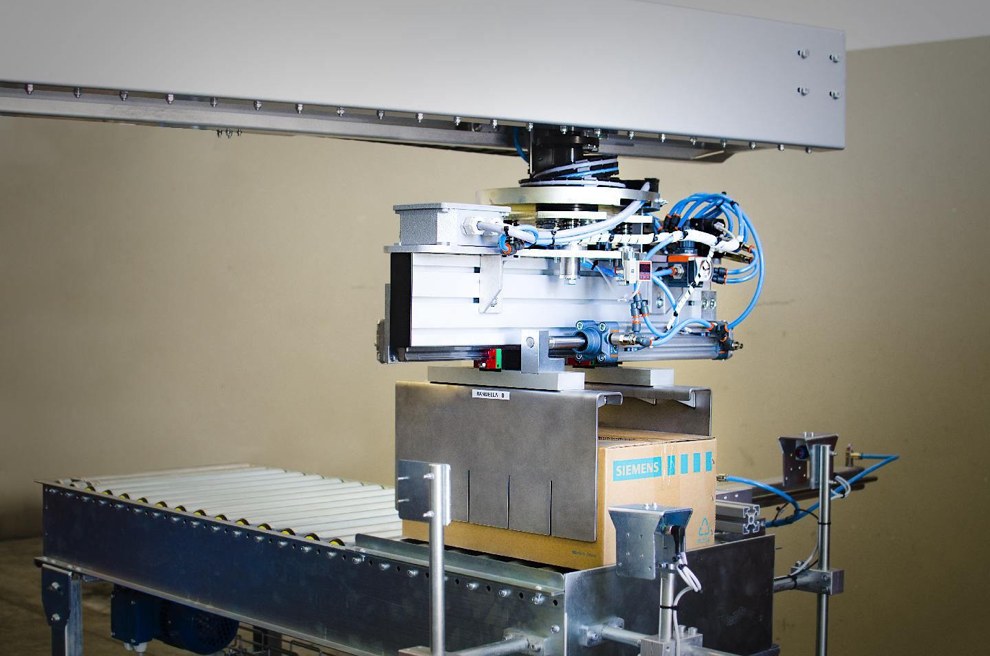 Pinza pneumatica adatta a tutti i tipi di scatole e fardelli. Portata massima di 50 Kg.