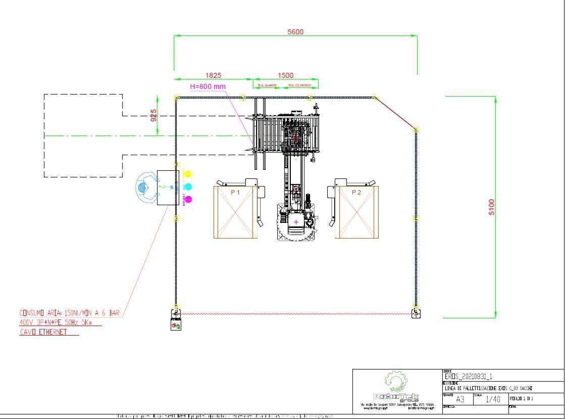 • N°1 Robot pallettizzatore EROS: è un pallettizzatore economico con facilità di utilizzo e installazione, ma con caratteristiche tecniche di elevato livello studiato per avere alte prestazioni per soddisfare l'esigenza di gestire una linea di produzione o più linee. Il nuovo Robot monta dei motori Brushless Siemens accoppiati a riduttori Bonfiglioli. Nella progettazione del pallettizzatore EROS è stata ricercata una morfologia che gli consente di essere utilizzato in più configurazioni differenti dal punto di vista del layout di pallettizzazione (rotazione 320°), con conseguenti vantaggi per la flessibilità di impianto